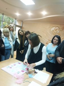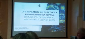Лілія Іванівна, практичний психолог КЗ ЧОЦЕВ “Юність Буковини”, провела лекцію-практикум “Арт-терапевтичні практики у роботі керівника гуртка. Як уникати професійного вигорання у творчій сфері” Гафійчук Оксана Валеріївна, дизайнер одягу, провела майстер-клас “Живопис з елементами колажу”