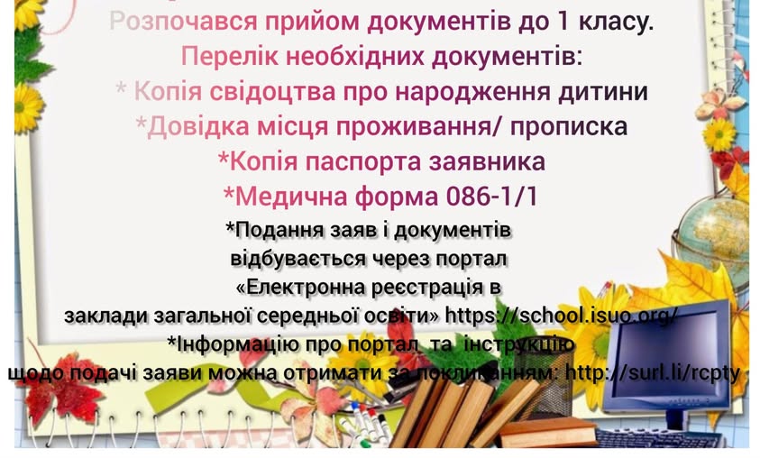 З 01.04.2026 року розпочався прийом заяв та документів для зарахування дітей до 1-го класу та завершиться 31 травня.