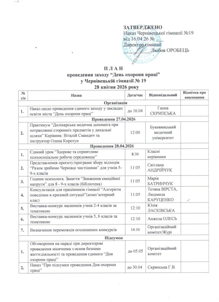 Річний план роботи Чернівецької гімназії №19 на 2025/2026 н.р.